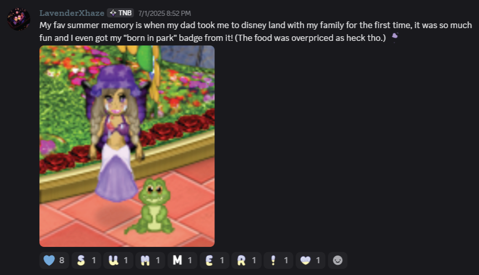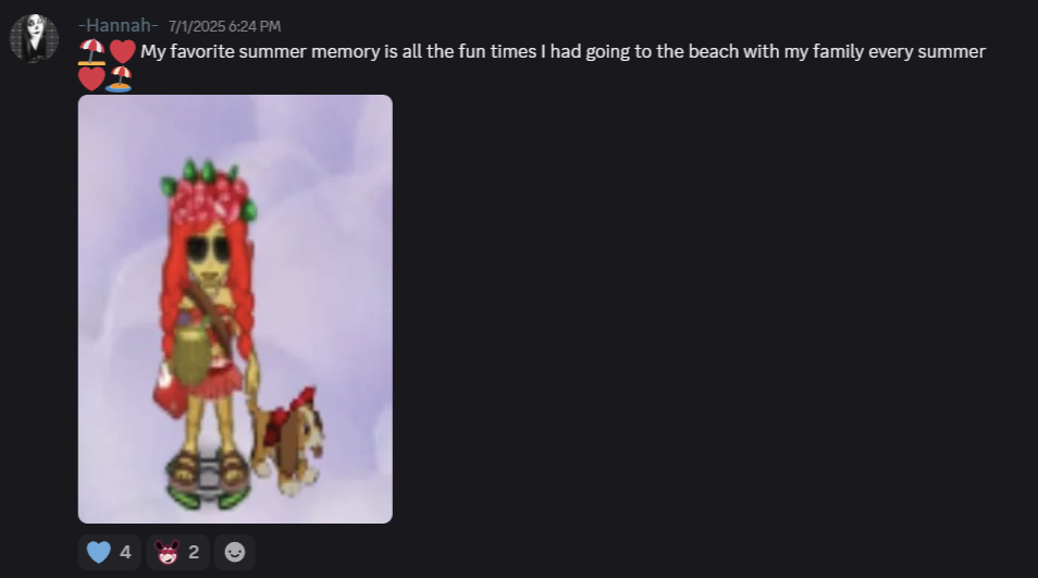 I pitched, designed, and hosted a Discord event called Summer of core memories. Players would dress up and share their favorite Summer outfits along with a Summer memory if they wished. They were awarded 2 sets of the prizes I pitched and designed. This event got the community engaged and sharing memories together.