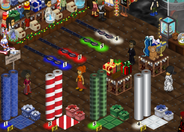 For Festive Fantasy month I chose to design multiple consolation prizes for the guests to collect. I designed a consolation room guests were teleported into when losing a Host event. The prizes consisted of wrapping paper columns, 1x1 wrapping paper carpet squares, and various gift box furniture pieces.
