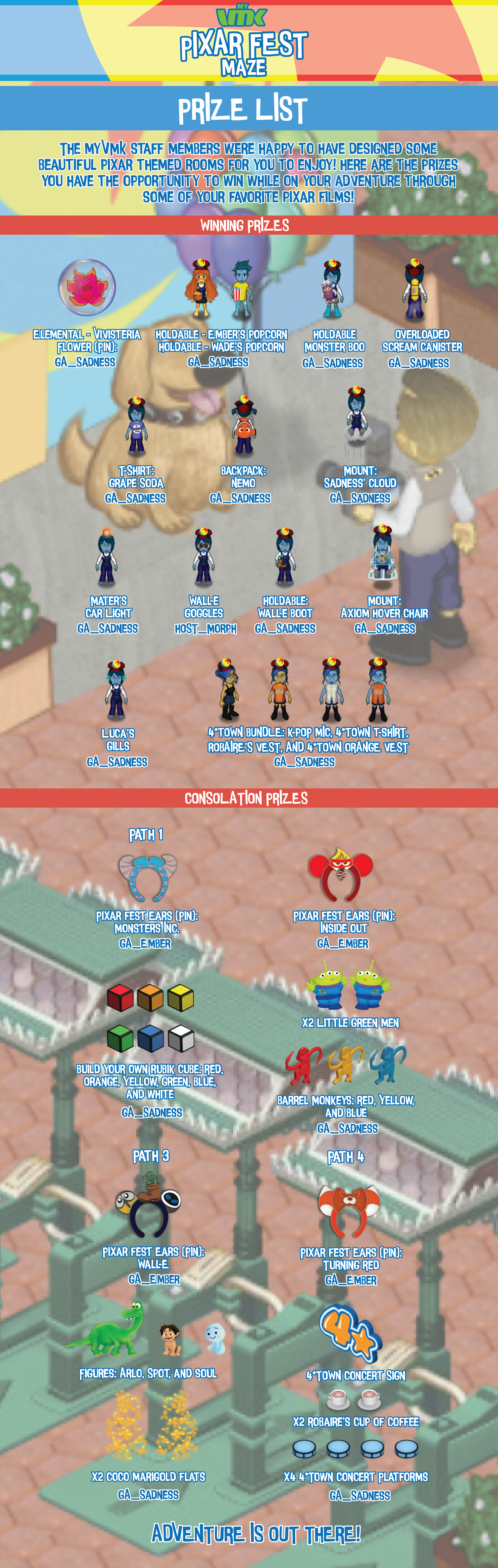Featured here is the promotional graphic I designed, featuring all the prizes that could be obtained from the Pixar Fest 2024 Maze. This graphic was posted on the MyVMK Discord Server to properly communicate this information to the player base.