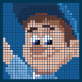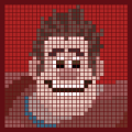 Pixels in Pixel Portraits: Vanellope, Ralph, Puddles, Fun Bun, and Felix.