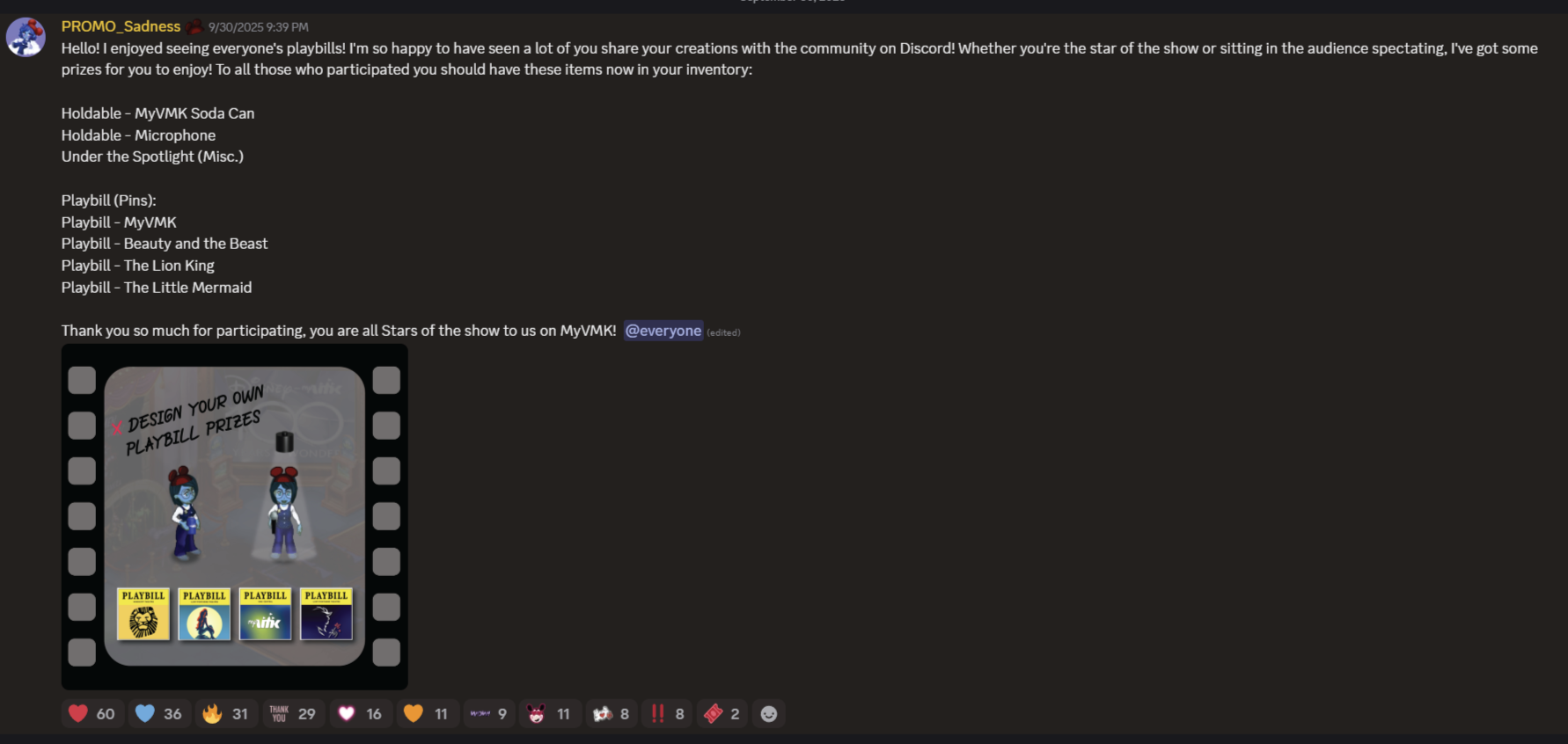 I conceptualized and hosted a promotional activity to drive players to participate in the game. It required them to design their own Playbill and at the end they would receive special prizes. I promoted this activity on MyVMK’s official Discord channel.